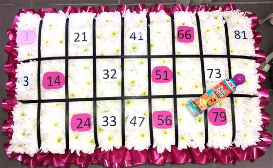 A lovely tribute for a bingo fan, the base is 16" x 12", with some of the board marked off in pink - any other colour available