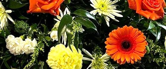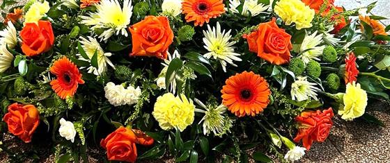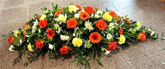 A beautiful bright casket spray filled with an assortment of creams and oranges, including roses, gerberas and chrysanthemum, smaller or larger can be created