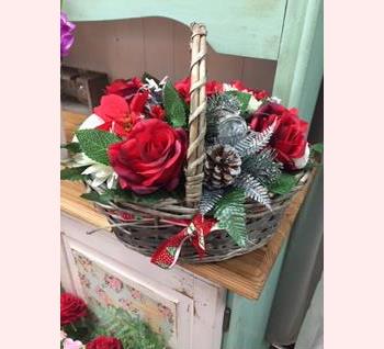 Festive basket filled with artificial flowers, pine cones and berries