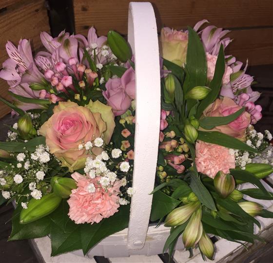 Choose from a range of colour options and we will create a traditional basket arrangement using seasonal blooms and foliage.