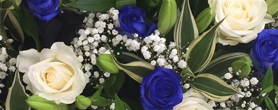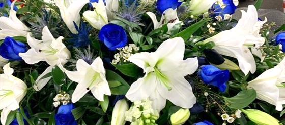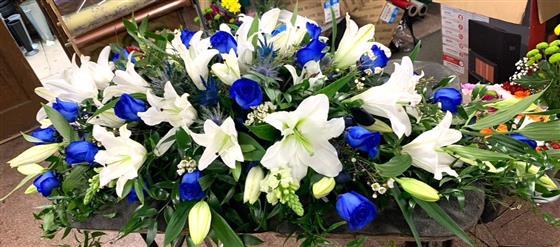 A stunning casket spray with white and blue roses, size shown is 4' - other sizes and colours available