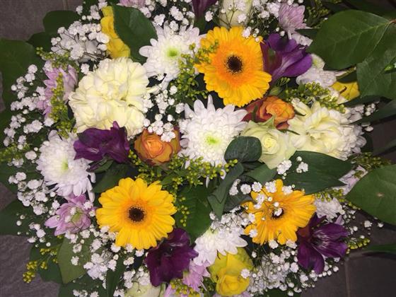 This large wreath is 17" and contains beautiful yellow roses and gerberas, chrysanthemums, purple lythansums and dark green foliage