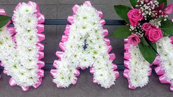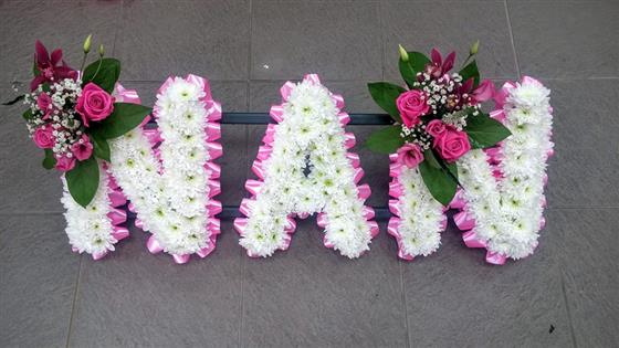 Lovely tribute for a Nan with a white base and co ordinating pink ribbon and spray, each letter is approximately 12"