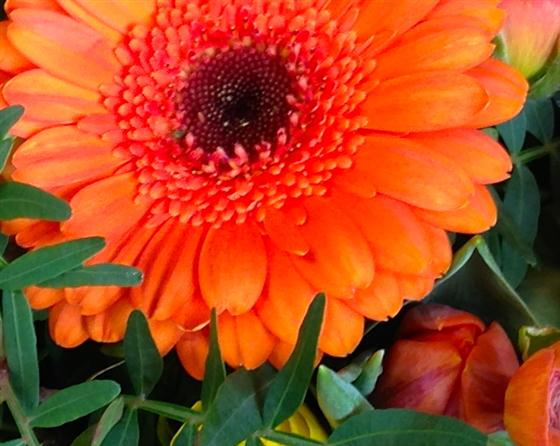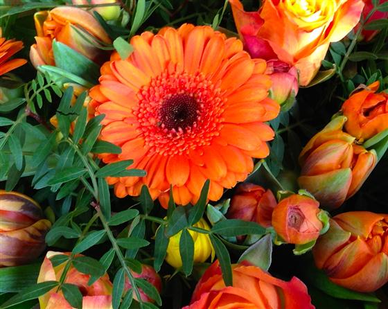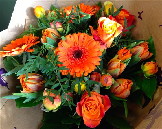 Bright oranges including tulips, gerberas and roses presented in a contemporary wrap.