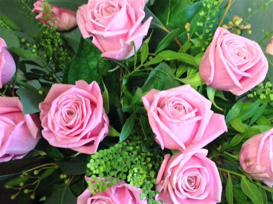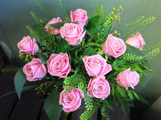12 beautiful pink roses displayed in an arrangement box with presentation bow