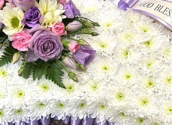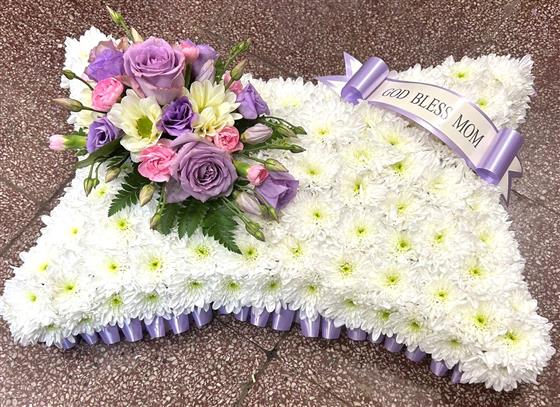 This large pillow is edged with a lilac ribbon with a coordinating spray, price includes a sash with any name on