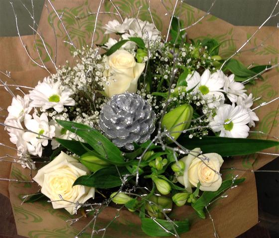 White roses, white lilies, chrysanthemums and silver twigs make a classic festive bouquet.