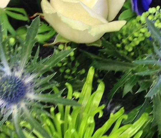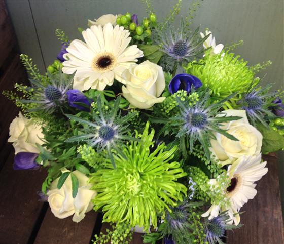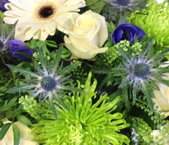 A simple colour palate of blues, whites and limes including anemones, eryngium, roses and gerberas presented as a boxed bouquet.