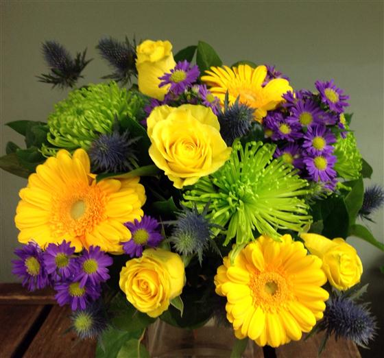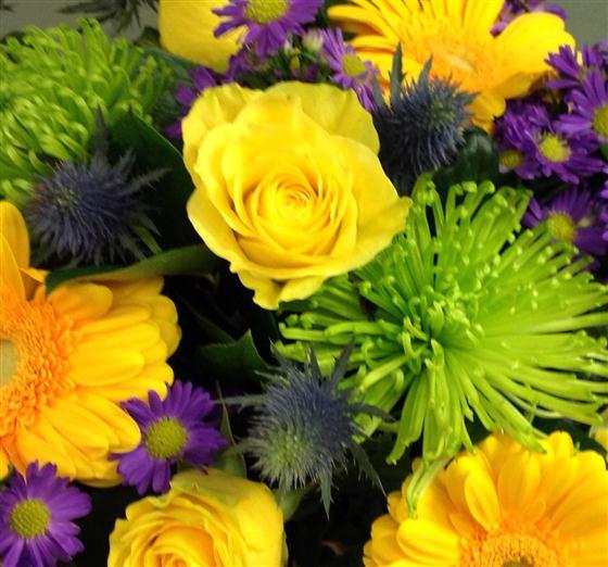 Cheerful array of yellow roses, gerberas, green Anastasia blooms, blue thistles and. Purple September flowers.