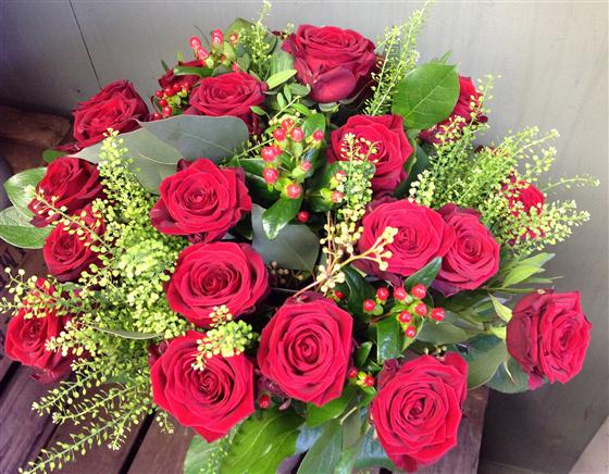 Two dozen top quality velvet red roses, berries and dark green foliage. The best you can buy !