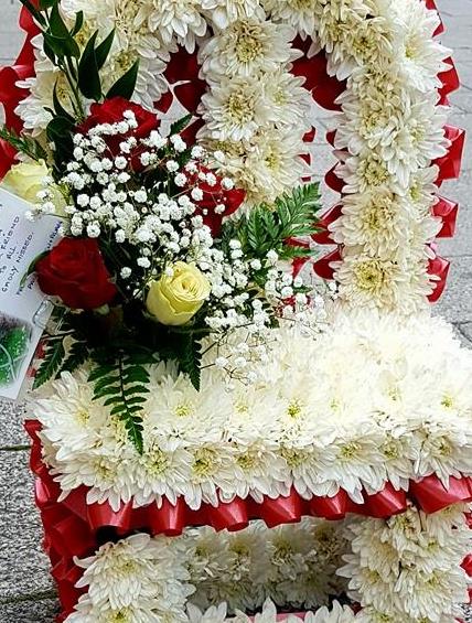 A beautiful tribute for someone special this chair in white flowers with red flowers used as accessories, size is 24" x 12" approximately