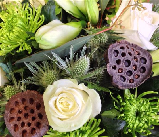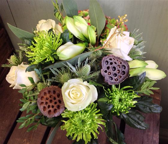 Stylish bouquet for the winter months. roses and green blooms. A popular choice.